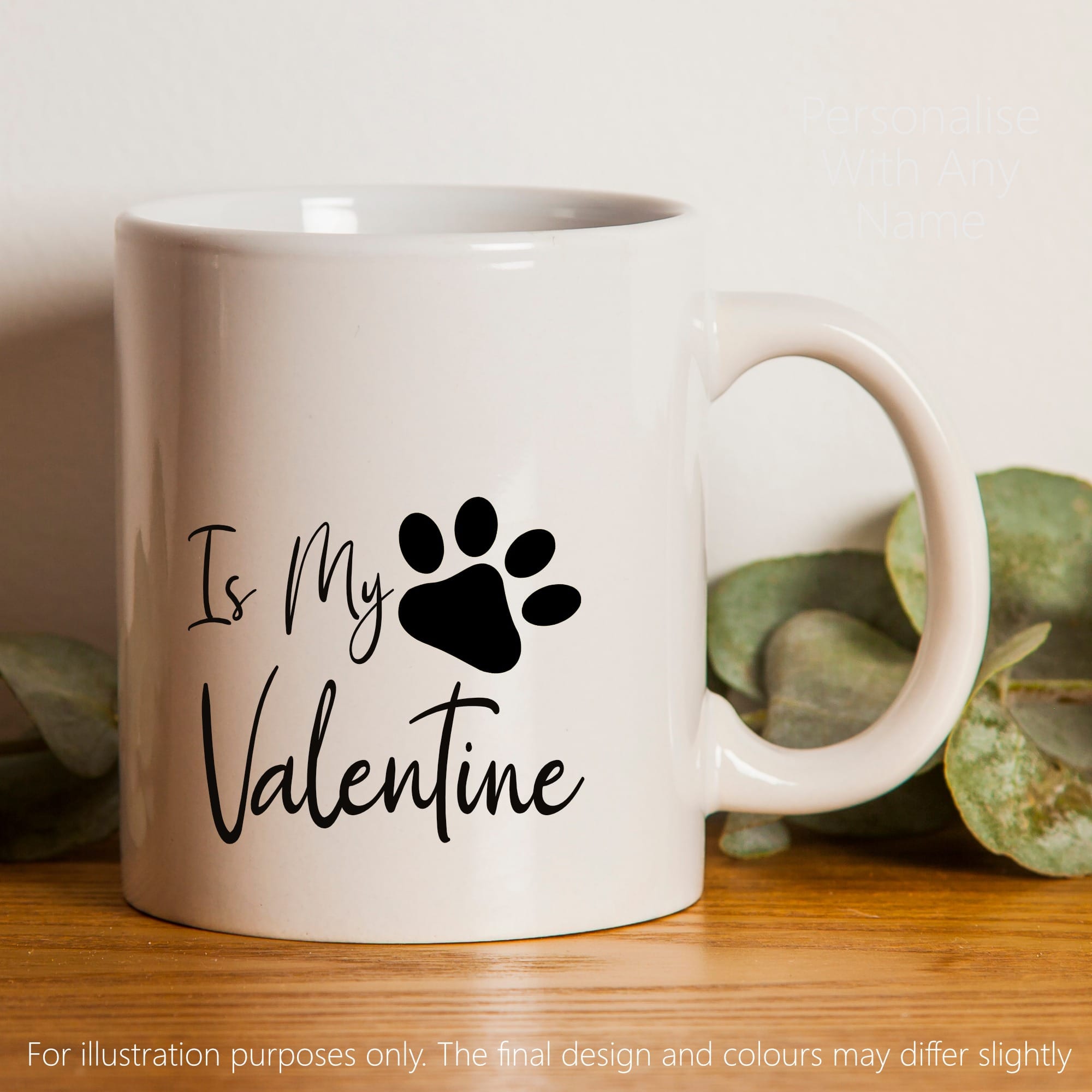This mug is the perfect valentines gift for any dog lover on Valentines day. Comes with the text “My Dog Is My Valentine” and the image a a pawprint. The first line can be changed to any text such as your pets name as shown in the photos. Please message us after purchasing with you choice of name if required.